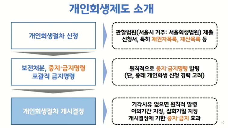 (이자는 전액, 원금은 최대 97%까지 면책) - 개인회생개시결정이 내려지면 변제요구, 가압류, 강제집행이 금지됨