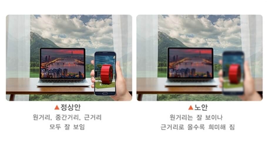 노안은 가까운 사물을 보는 시력이 떨어지는 증상인데요. 이는 나이가 들면서 수정체의 탄력이 감소되어 생기는 자연스러운 현상입니다. 정상 시력일 때는 원거리, 중간거리, 근거리에 있는 사물들이 잘 보이나, 노안이 오게 되면 근거리에 있는 사물들이 희미하게 보이기 시작합니다.